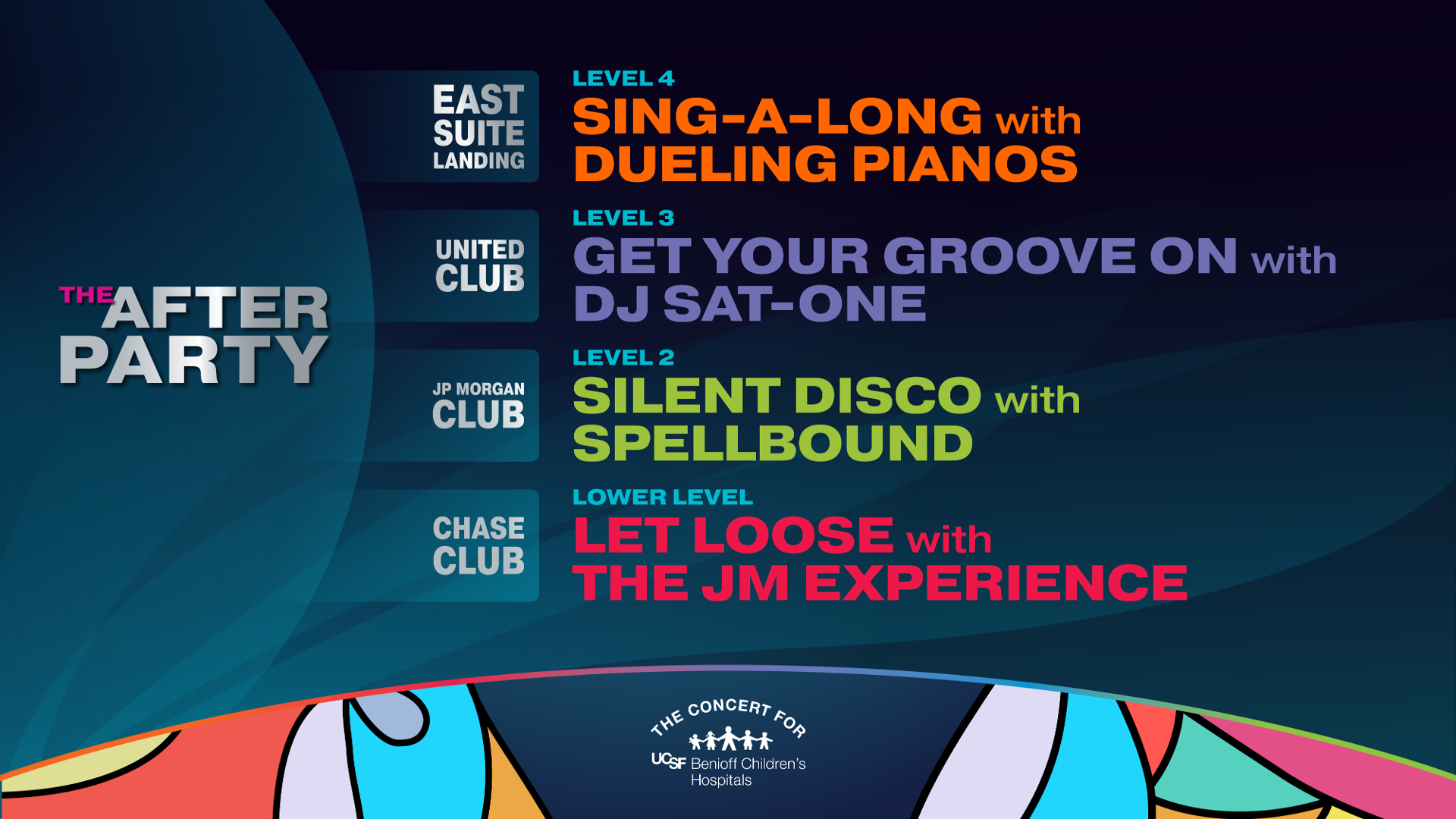 Following the intermission, the after party begins in Chase Center. Explore an array of entertainment, late night bites, and special surprises on East Suite Landing, United Club, JP Morgan Club, and Chase Club (see after party maps onsite for more details). All guests must have a UCSF Benefit credential to attend the after party.